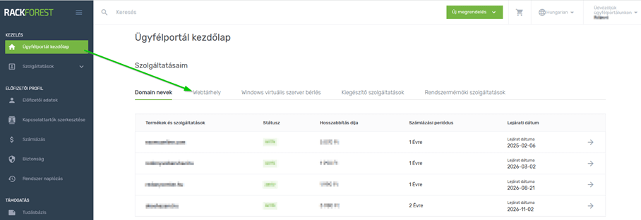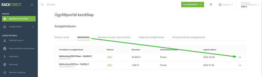 Lépjen be az Ügyfélportálra, ott válassza ki a Webtárhely menüpontot és kattintson a megnövelni kívánt szolgáltatásra.