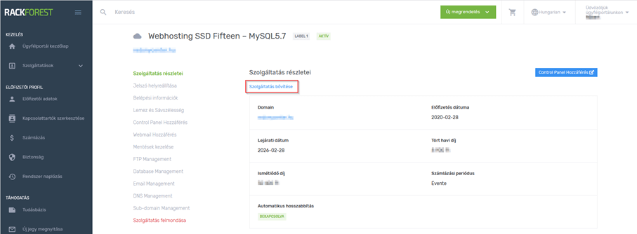 A megnyíló oldalon válassza ki a Szolgáltatás bővítése menüpontot és válassza ki a kívánt csomagot.