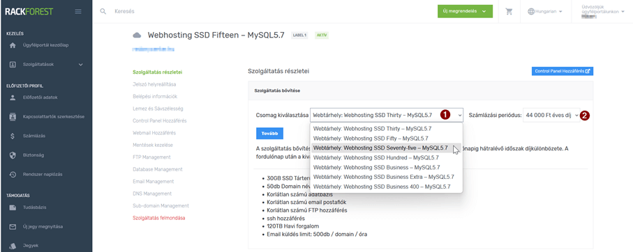 Az 1. menüpont alatt a webtárhely csomagjaink közül választhat, a 2. menüpont alatt annak számlázási ciklusáról.